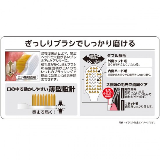 허브러시의 상식을 바꾸는 폭넓은 헤드의 「프리미엄 케어 시리즈」.한 번 사용하면 차이를 알 수 있는 극상의 연마 기분.헤드의 두께가 메이커 종래품보다 약 25% 얇아져 입안에서 움직이기 쉬운 박형 설계.